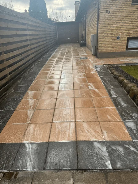 Som de eneste i Danmark tilbyder vi denne unikke rensningsmetode, der bekæmper selv de mest genstridige forureninger. Efter grundig rensning påførte vi en professionel algebehandling, der forhindrer fremtidig algeopbygning, og afsluttede med dobbelt nanoimprægnering for maksimal og langvarig beskyttelse.