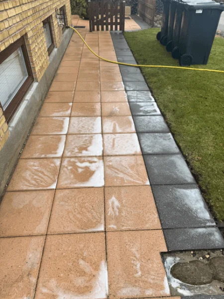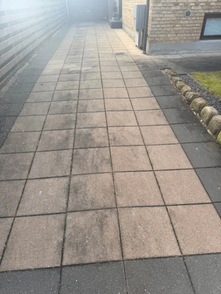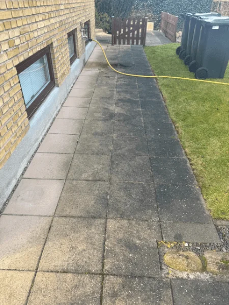 30 x 30 betonfliser kan over tid miste deres farveintensitet og blive mørke, især på steder med høj belastning. Med vores specialbyggede udstyr og skånsomme 90-graders hedvandsrensning fjernede vi effektivt års opsamling af snavs, alger og vejrpåvirkninger uden at beskadige flisernes overflade.