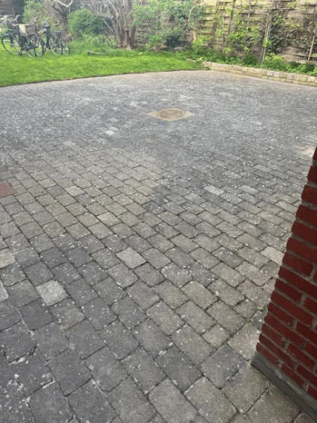 Med 150 m² herregårdssten var dette et projekt af betydelig størrelse, der krævede både erfaring og det rette udstyr. Som de eneste i Danmark anvender vi 90-graders hedvandsrensning, der skånsomt men grundigt fjerner års opsamling af alger, flisepest og ukrudt uden at beskadige stenens karakteristiske overflade.