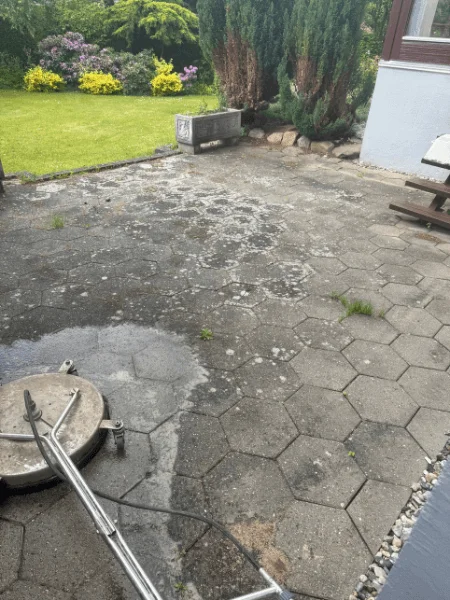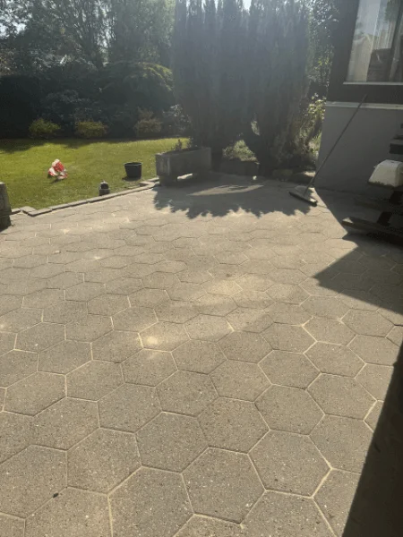 Vores erfarne medarbejdere sikrede ensartet behandling over hele det store areal, så udeområdet fremstod ensartet flot og lyst – præcis som kunden ønskede til hussalget. Efter den grundige rensningsproces påførte vi en professionel algebehandling og afsluttede med nanoimprægnering for langvarig beskyttelse.