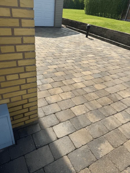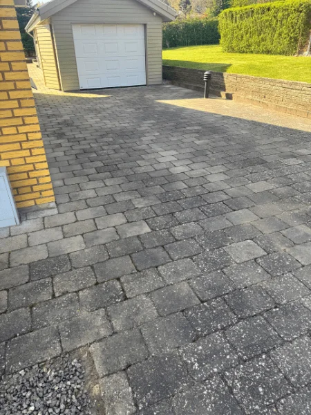 Som de eneste i Danmark tilbyder vi 90-graders hedvandsrensning, en specialiseret metode der skånsomt men effektivt fjerner alger, flisepest og ukrudt uden at beskadige flisernes overflade. Vores specialbyggede udstyr sikrer optimal rensning selv på store arealer som dette 165 m² projekt.