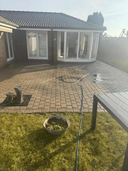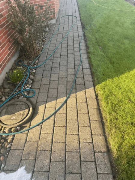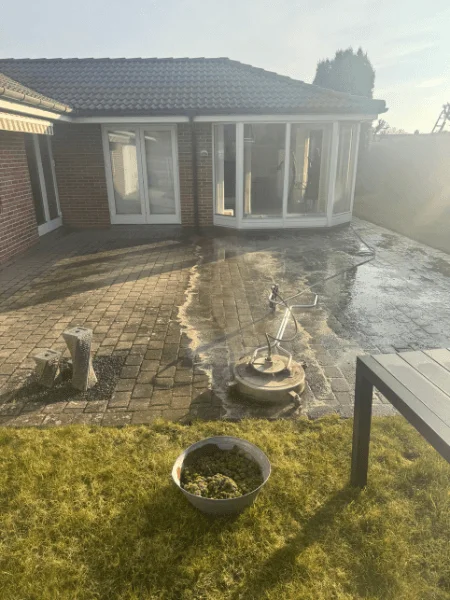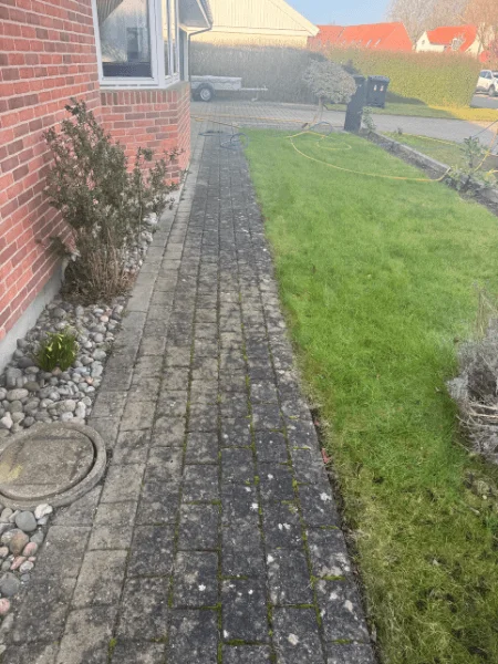 Med 180 m² herregårdssten var dette et projekt af betydelig størrelse, der demonstrerede vores kapacitet til at håndtere store arealer med samme høje kvalitet som mindre projekter. Som de eneste i Danmark anvender vi specialbygget udstyr med 90-graders hedvandsrensning, der effektivt bekæmper alger, flisepest og ukrudt uden at kompromittere stenens integritet.