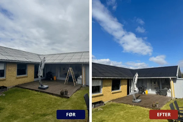 Efter grundig rensning og inspektion blev taget behandlet med vores specialudviklede tagmaling til asbesttag i sort farve. Ejendommen havde skjulte tagrender, hvilket krævede særlig teknisk ekspertise under arbejdsprocessen. Vores tagspecialister anvendte specialudstyr godkendt af Arbejdstilsynet for sikker håndtering af fibercement herunder asbest.
